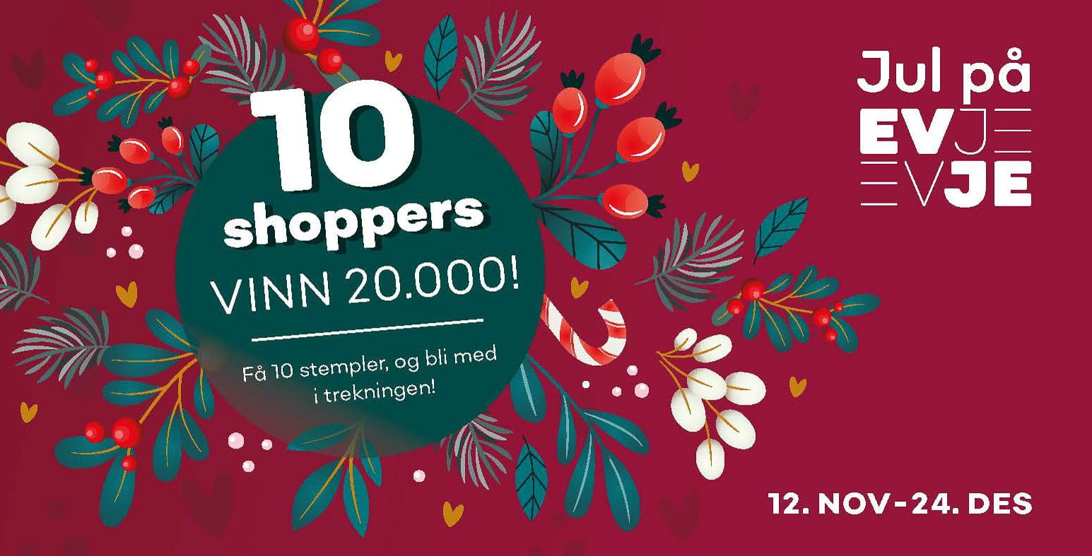 Premiene i årets 10-Shoppers er veldig spennende. Førstepremien er altså et gavekort – Evjekortet – på hele 20.000 kroner! Andrepremien er et Evjekort på 5.000 kroner, mens tredjepremien er et Evjekort med en verdi av 1.000 kroner.