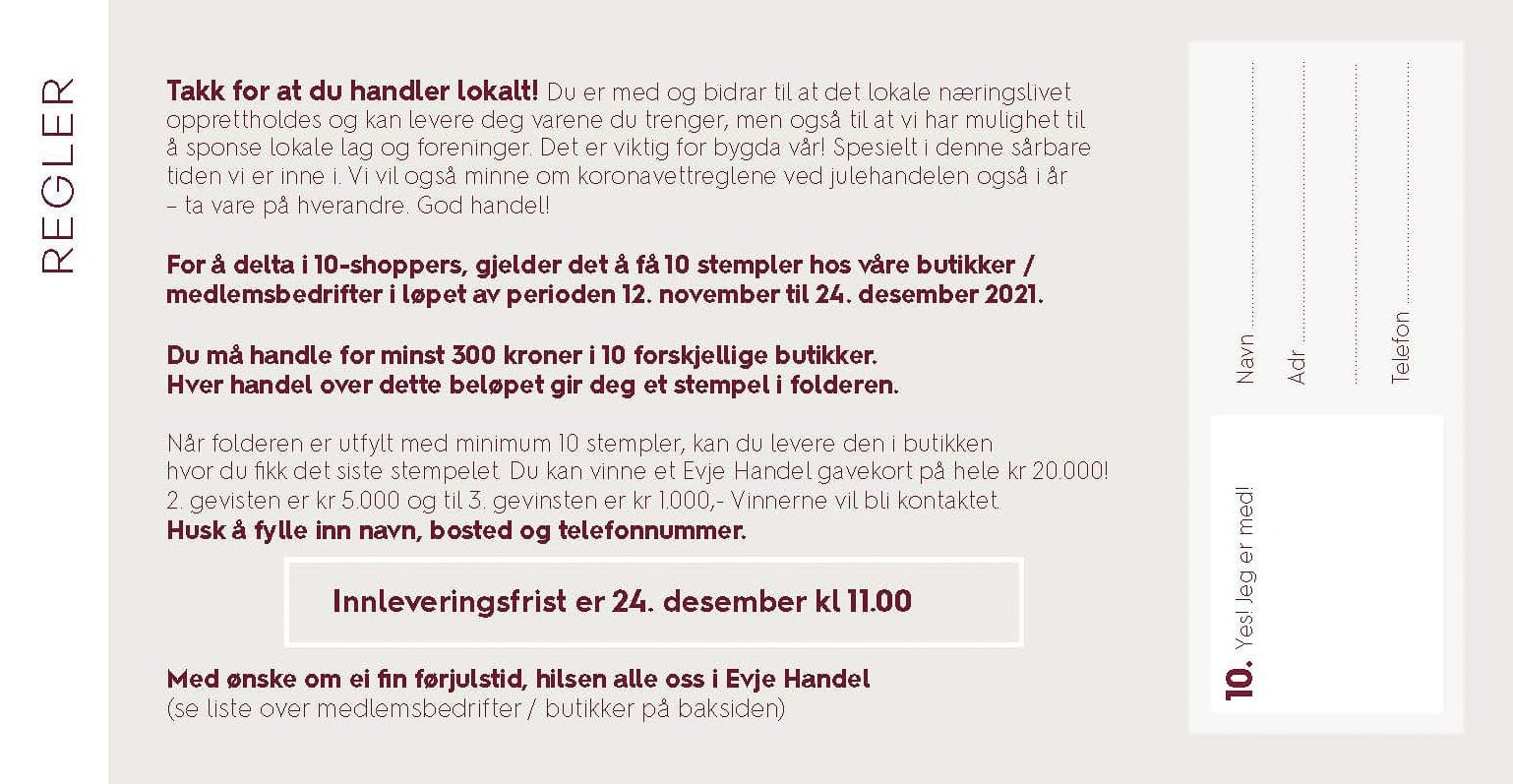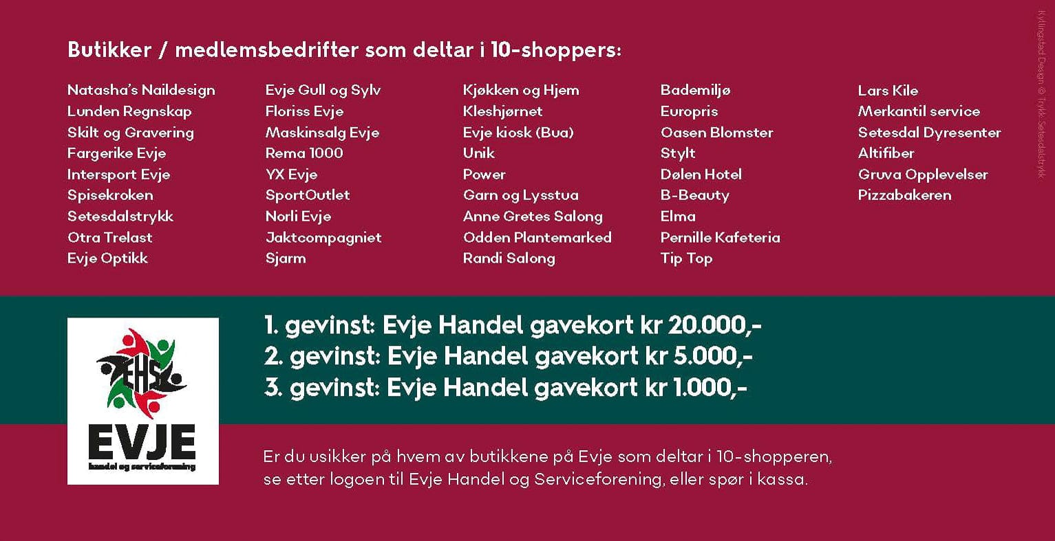 Vi gleder oss enormt til å følge årets julehandel på Evje, og ønsker alle som deltar på 10-Shoppers masse lykke til. Ikke minst er vi takknemlige og glade for at dere velger å bruke de lokale butikkene våre, slik at det brede utvalget av bedrifter kan bestå.