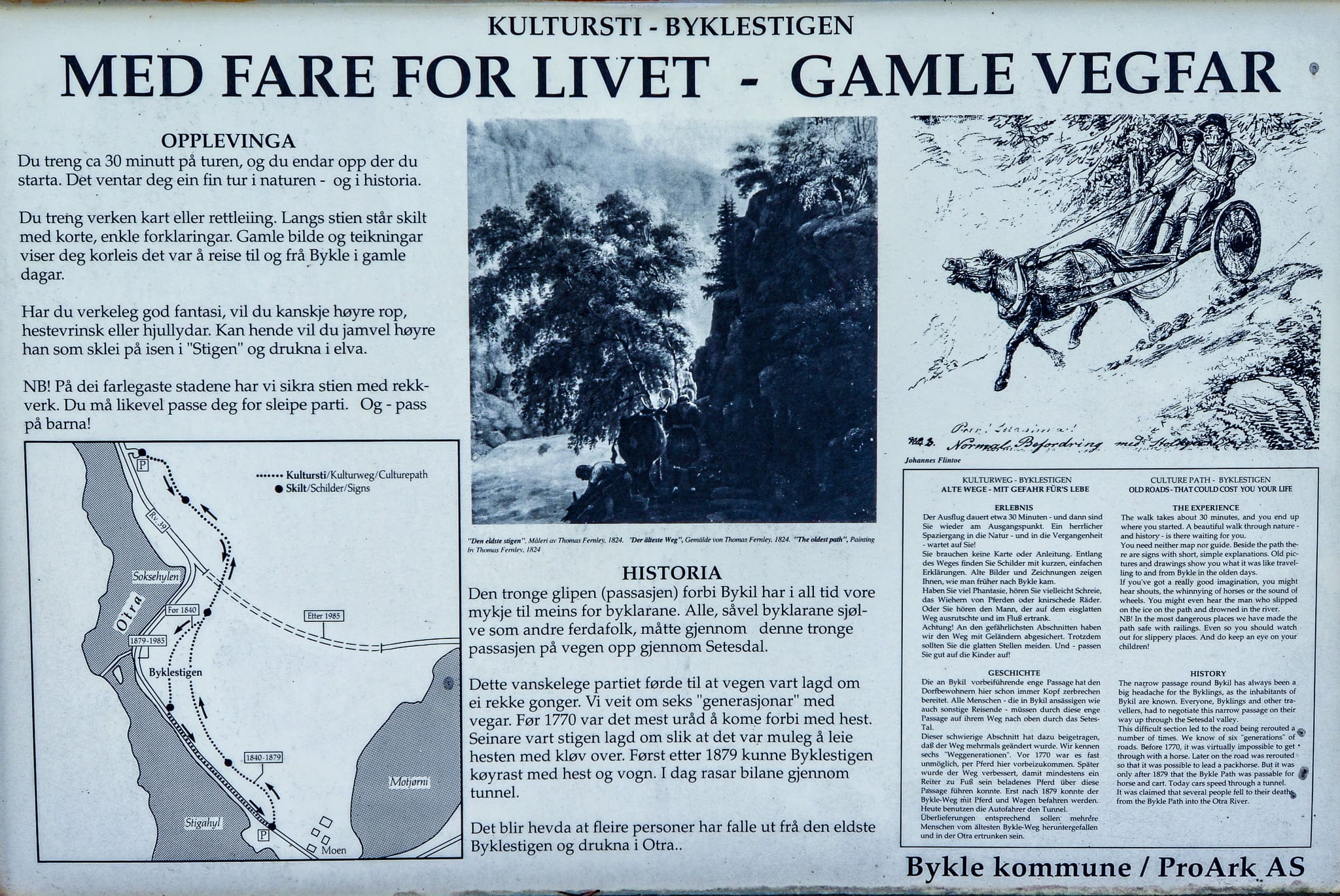 Byklestigen vart vald til Bykle kommune sitt kulturminne i kulturminneåret 1997. Bykle kommune/Pro Ark har sett opp fine informasjonstavler som fortel historia fleire stadar.